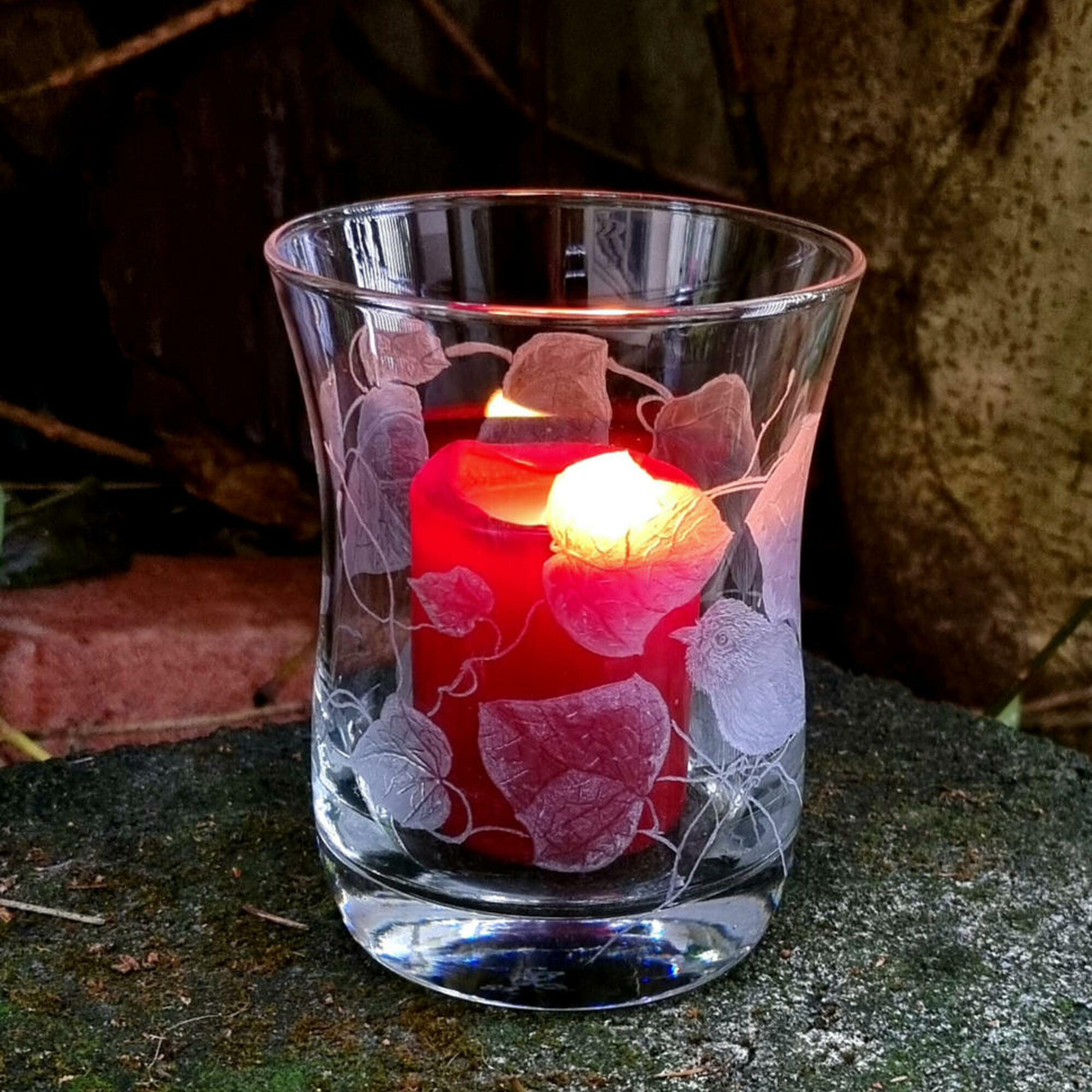 This Hurricane Glass (8.8cm Ø, 11.2cm H) has been lovingly hand engraved with ivy leaves and a little robbin.